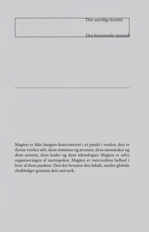 Magten er ikke længere koncentreret i et punkt i verden, den er denne verden selv, dens strømme og avenuer, dens mennesker og dens normer, dens koder og dens teknologier. Magten er selve organiseringen af metropolen. Magten er vareverdens helhed i hver af dens punkter. Den der besejrer den lokalt, sender globale chokbølger gennem dets netværk.