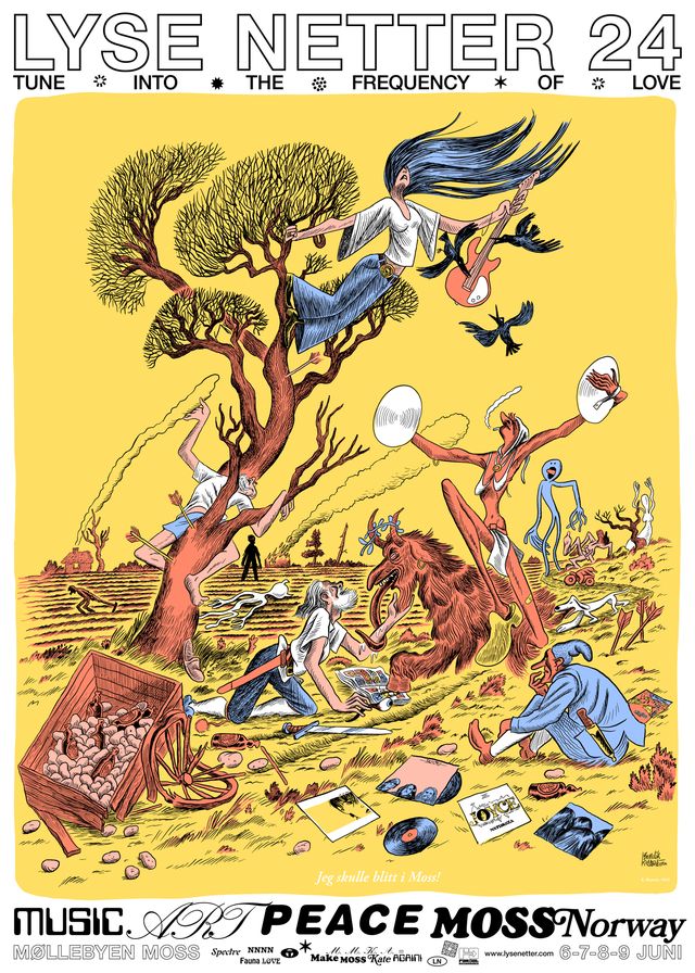 LYSE NETTER 24 ble arrangert 6.-9. juni 2024 i Møllebyen i Moss. Bendik Kaltenborn laget illustrasjon til hovedplakaten, Espen Friberg designet, Emil Nikolaisen hadde et par fingre i suppa; psykedelisk hakkebakkeskog/mølleby, begrenset opplag; et lokal- og musikkhistorisk dokument. Gjør seg godt i en ramme i stua, på kjøkkenet eller i studioet, først til mølla.